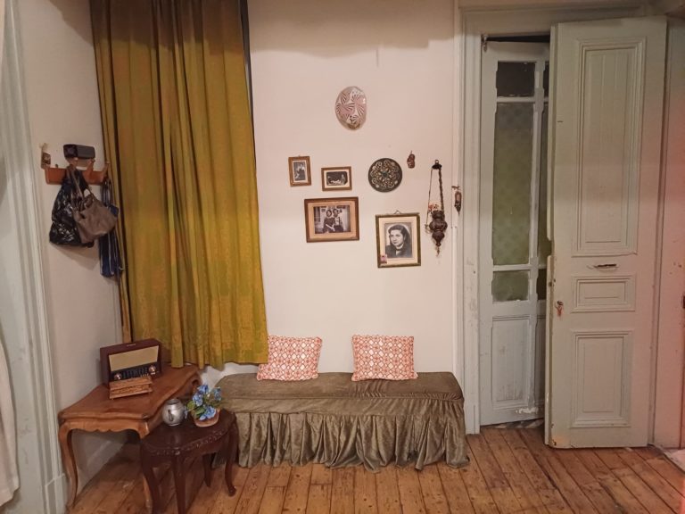 In this context, Zarifi is the surname of the original owners of this edifice—a prominent, long-established Greek-Orthodox (or Rum, as they are known in Turkish) family from Istanbul. Today, the building belongs to the Beyoğlu Central Rum Girls’ School Foundation, an institution within Istanbul’s deeply rooted Greek-Orthodox community. The flat on its second floor is rented by Istos, an independent publishing house dedicated to the history and culture of the Greeks of Turkey. It was used as an office until Istos decided to transform it into a stage in 2023. Upon entering the building, one immediately notices the meticulous care taken by the creators of the play to craft a holistic experience of an Istanbulite Rum building. As you climb up the grand 19th-century staircase, you hear sounds in Greek: a young girl calling out to her γιαγιά (grandmother), fragments of conversations, and the ambient sounds of apartment life.
